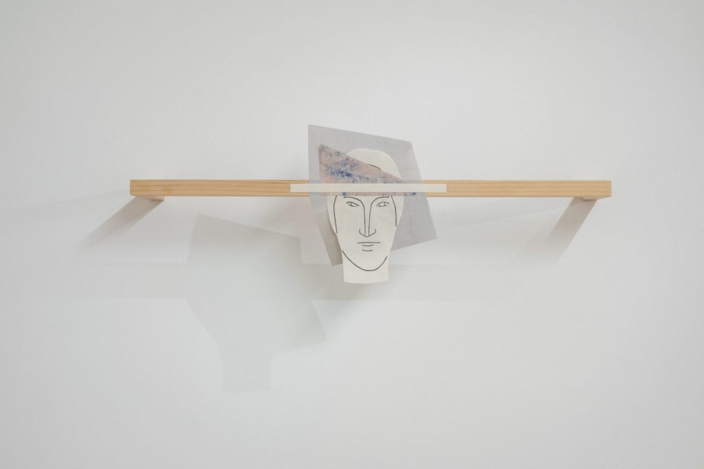 いっぽう、近藤と冨井のコラボレーションがここLOKO GALLERYでの展示で行われることを考えれば、もうひとつ予想できるパターンは、幻惑的な空間、あるいはそれこそ西洋の古典演劇に見られる舞台のような空間が立ちあがることだ。奥行きは浅く、天井は極端に高い。展示空間は吹き抜けを介して上階のフロアにつながっていて、その各所に絵画あるいは彫刻として現れるいくつかの頭部の像を起点とした、さまざまな装置が立ち上がる。像も装置も、なにかを積極的に記述したり説明したりしないという意味で抽象化されているが、そのぶんその視覚的な形式によってその場を訪れたひとの動勢を規定する。ひとはだれに言われずとも、顔とおぼしき面に正対してみようとするだろう。あるいは近藤の画面を支えるグリッドはわたしたちの視線を壁面の縦横に滑らせ、冨井の彫刻の各所に刻まれた切子面は、わたしたちの視線を鋭く斜め奥へと逸らすだろう。