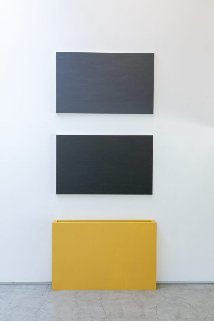 6個の筐体を2つずつ3段に重ねた灰褐色のトルソが描かれた絵画は、2016年に制作され、現在も紫牟田の鎌倉のアトリエに掛けられている。この絵画を発端として、6点の立体トルソの制作へと展開し、さらにそれらを収める箱が制作された。箱はトルソを保管する容れ物であると同時に、展示の際には台座として機能し、本作における重要な要素となっている。