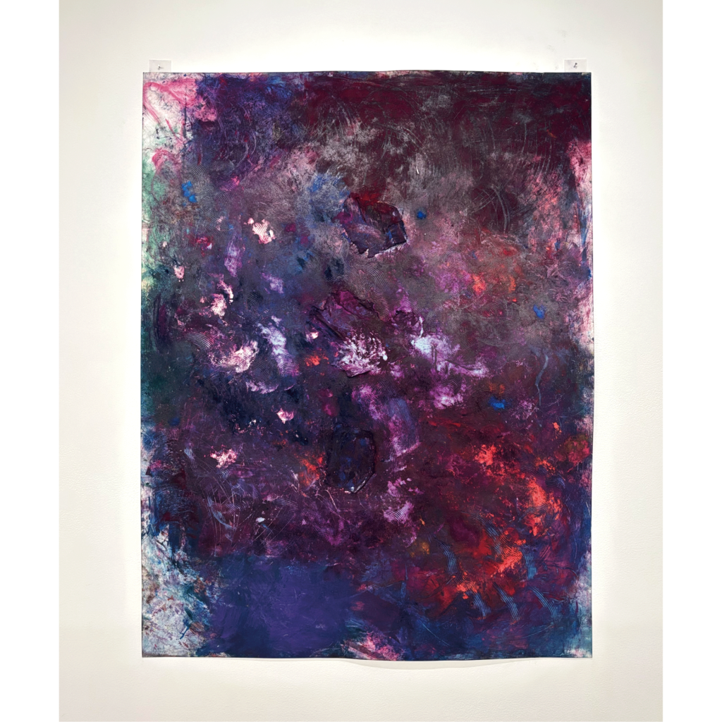 今回の展示においてアンダーソンの作品は、空間との共鳴関係のなかで一層の変容を見せています。物質としての素材は背景へと退き、色彩は視覚的要素にとどまらず、制作行為の記憶そのものとして立ち現れます。結果として、作品の輪郭は曖昧化し、可視的な表層を越えて、非物質的かつ霊的な次元へと鑑賞者を誘います。