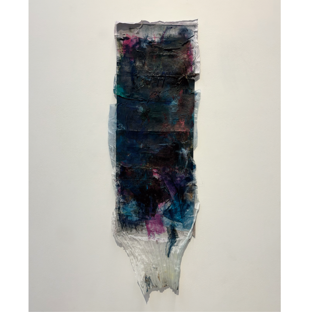 Left: Untitled, 110 × 33 cm, Mixed media on paper, (oilpastel, drypastel, ink and cloth on paper), 2025