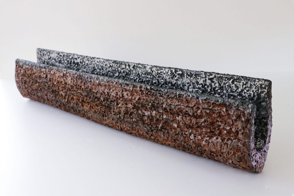 鉄は、溶ける、曲がる、歪む、錆びるという特性を持ちます。一見すると作家は自由に鉄を扱い、思いのままの造形を作り出すことが可能なように思えます。しかし彼女は鉄と格闘していくなかで、自身の表現を素材に押し付けようとせず、素材と作家との表現のせめぎ合いの中から生まれるかたちに強い関心を抱くようになりました。