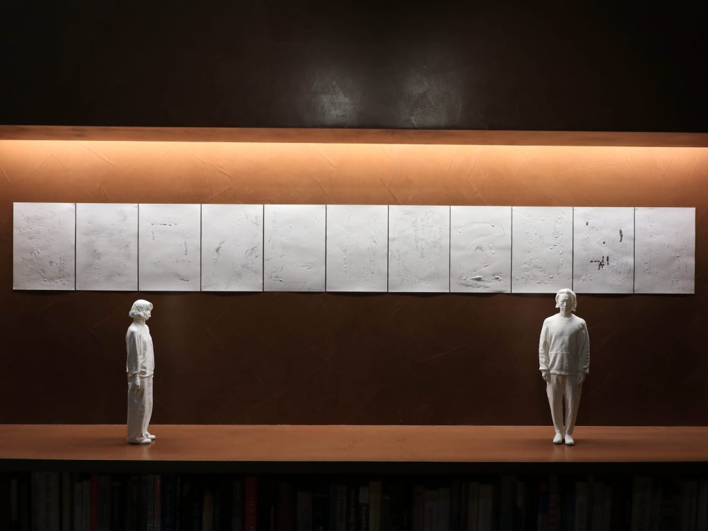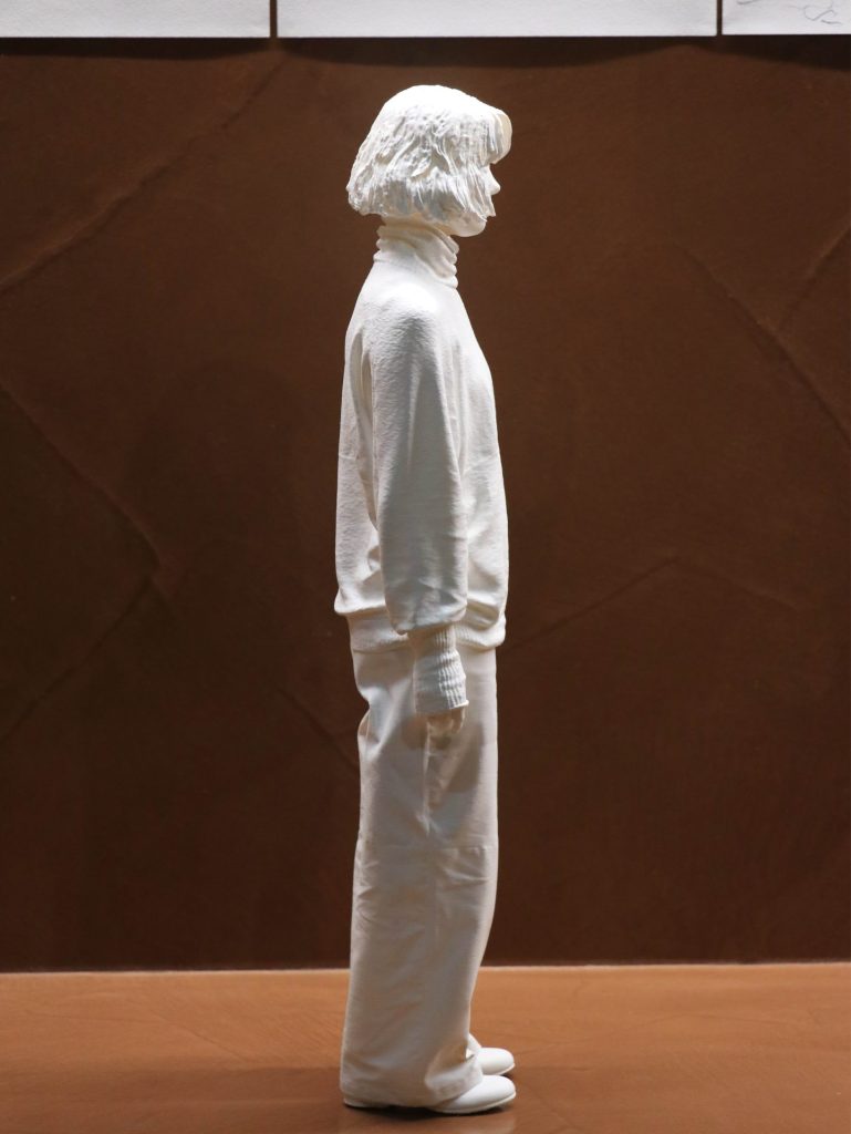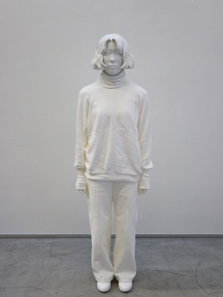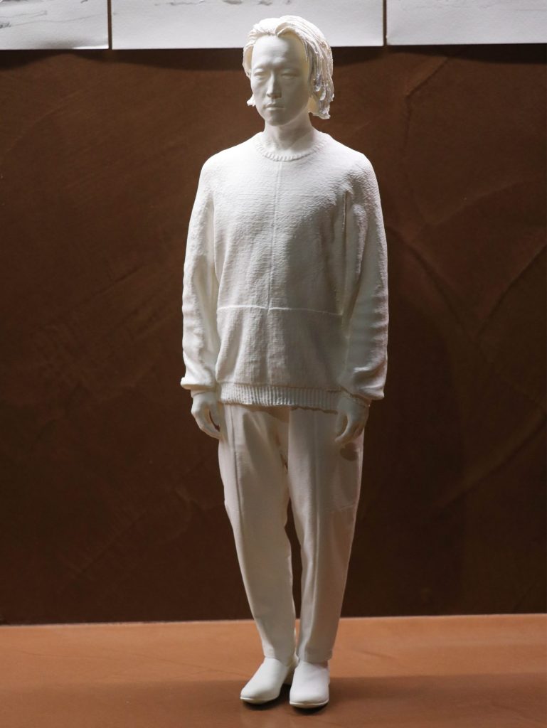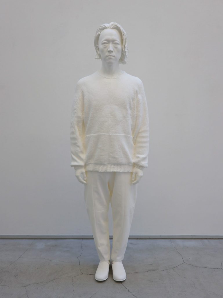 その新たな実践では、人物の形態を丸ごと3Dスキャナーによってデータ化し、3Dプリンターによって像を出現させるというプロセスが採用されています。作家の身体性を介さないデジタルの手業は、モデルと作家との距離を意図的に引き離すかのように作用しています。同時にそれは、水平線と直立像をめぐる座標軸の原点を探りつつ、より深い位相を見据える意志が見て取れます。